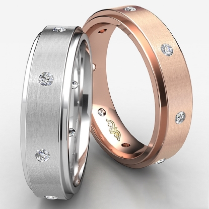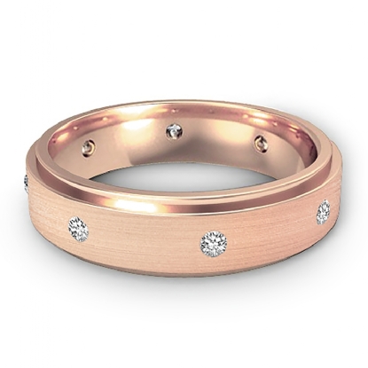 This elegant diamond matte men's eternity wedding band made from 14k Rose Gold. Featuring matte finished center with round cut bezel set diamonds and polished step edge.