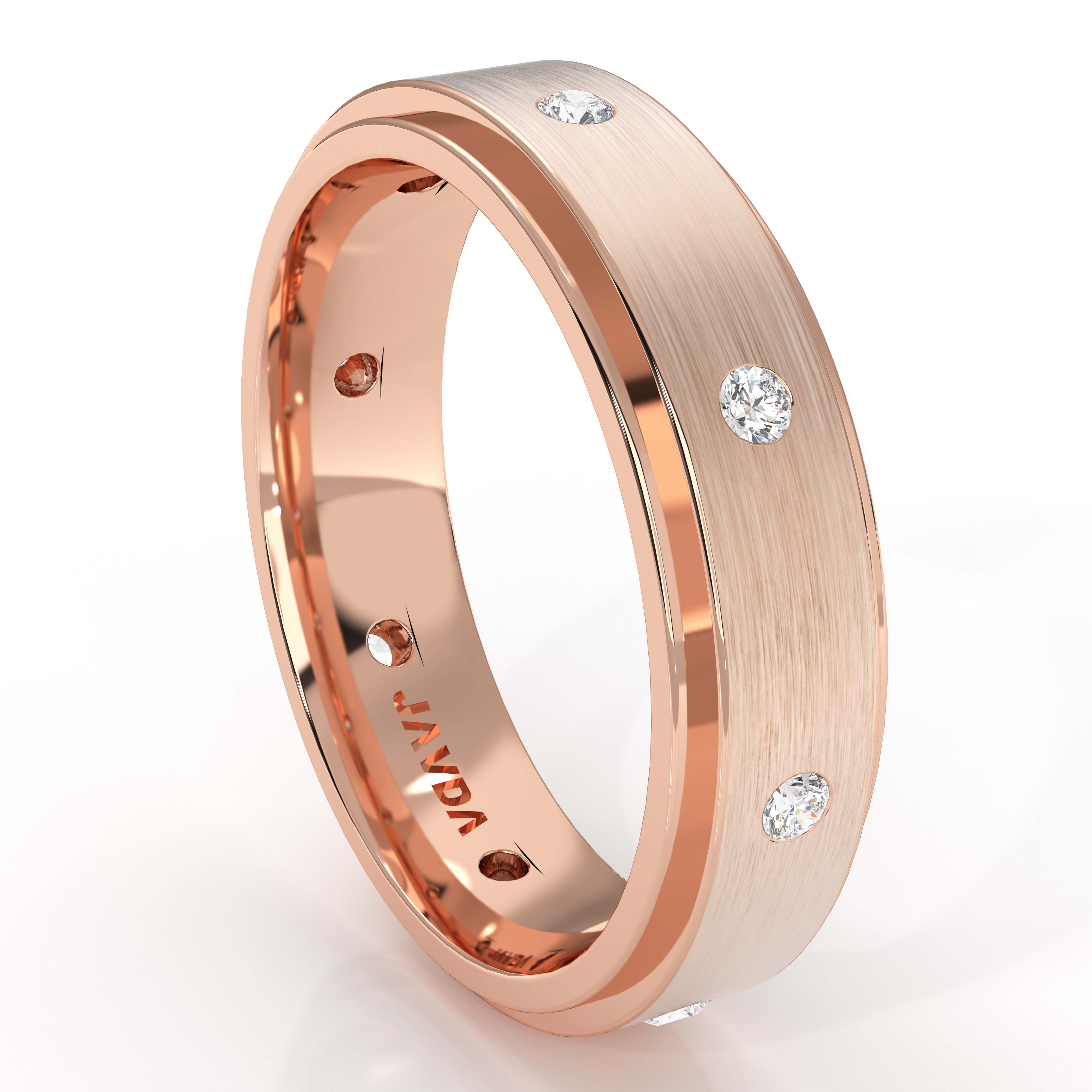 This elegant diamond matte men's eternity wedding band made from 18k Rose Gold. Featuring matte finished center with round cut bezel set diamonds and polished step edge.