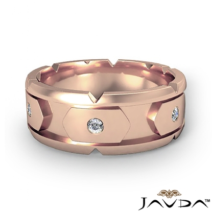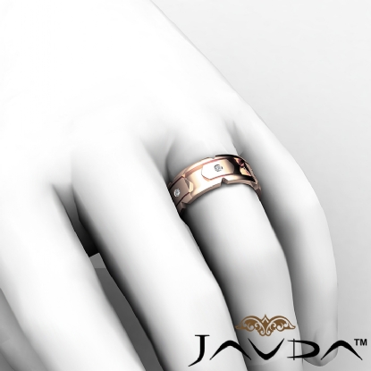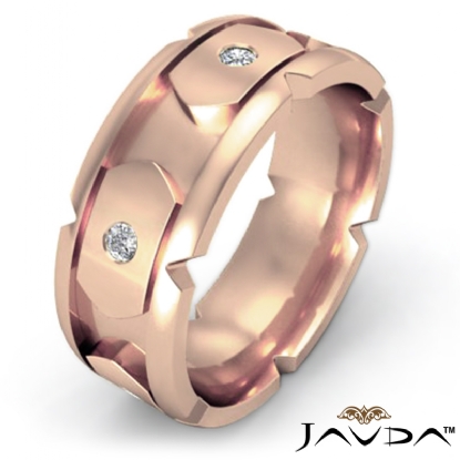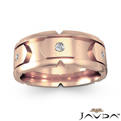The attractive men's diamond eternity wedding band is made from solid 14k Rose Gold. This 2 tone ring features polished finished with round diamond set in a bezel setting.
