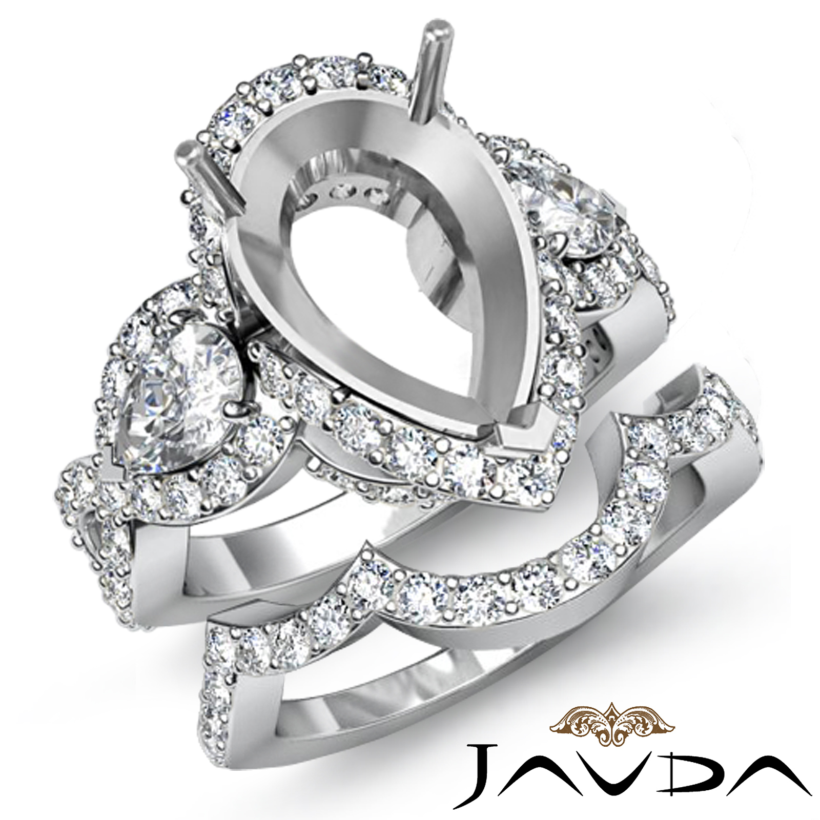 Beautiful & delicate, this 14k Gold White semi mount engagement ring and matching band features round pave set diamonds on halo and criss cross shank. The side pear diamonds add to the beauty of this three stone bridal set. (2.08Ct. tw.)