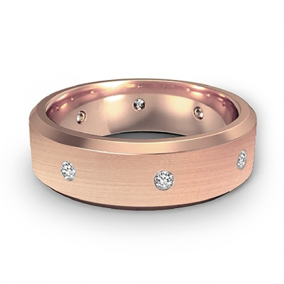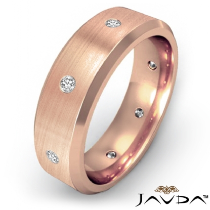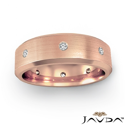 This classic diamond eternity men's wedding band is made from 14k Rose Gold. Featuring brushed finish center and polished beveled edges with total round diamonds set in a bezel setting.