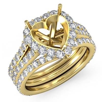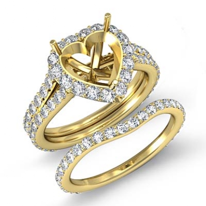 Tell her you love her with this semi mount heart engagement ring and matching band that features round diamonds in halo and split shank. This bridal set is made in 14k Gold Yellow. (1.8Ct. tw.)