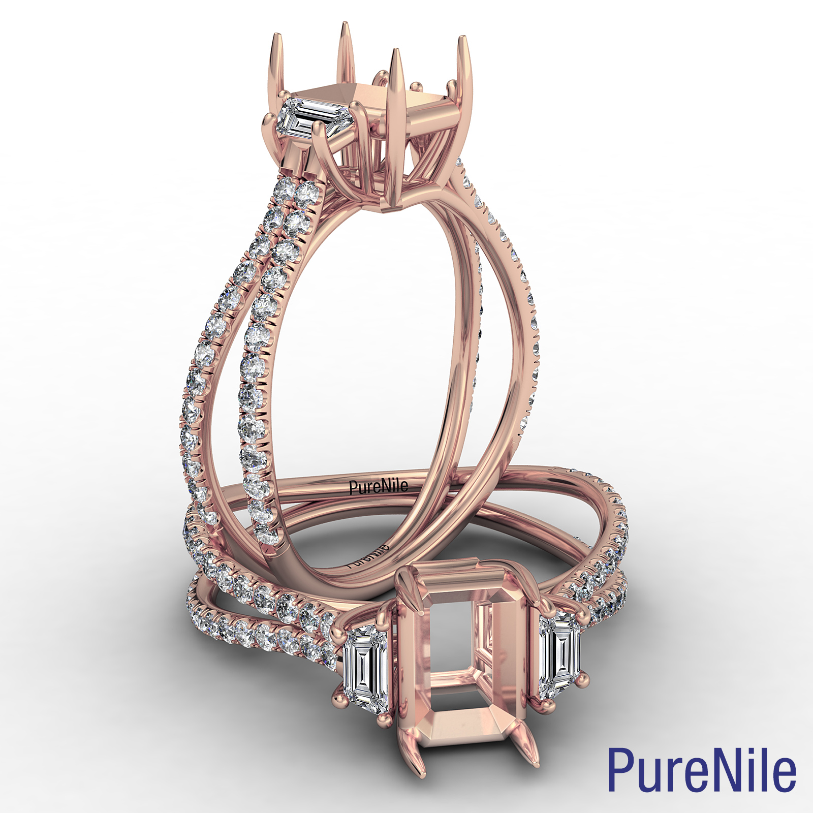 Women's three stone emerald diamond engagement ring crafted in 14k Rose Gold. This split shank diamond ring features emerald cut semi mount with side diamonds in a french U split pave setting on shank and
