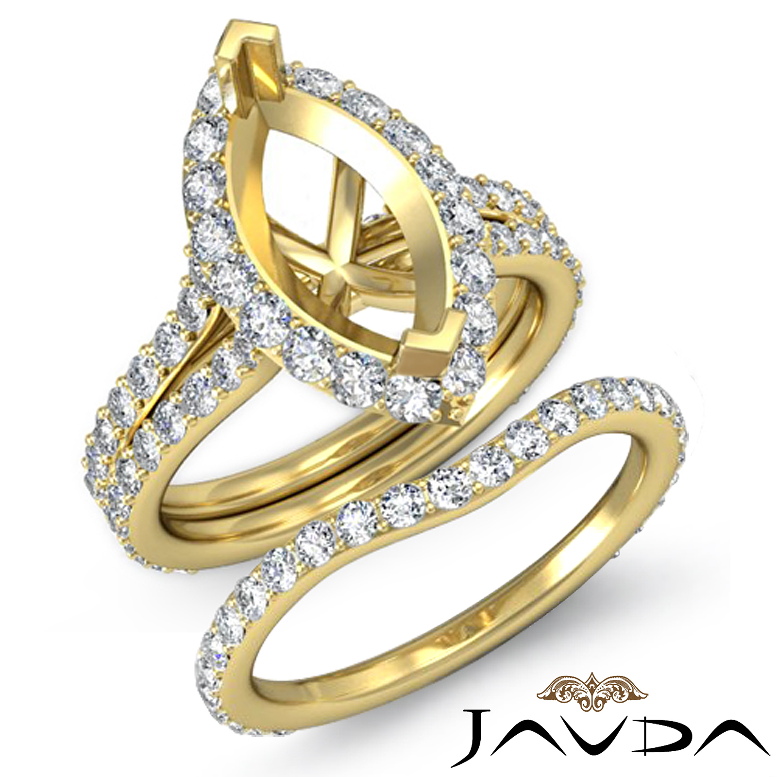 Show your love with this semi mount marquise engagement ring and matching band that features round diamonds in halo and split shank. This bridal set is made in 14k Gold Yellow. (1.9Ct. tw.)