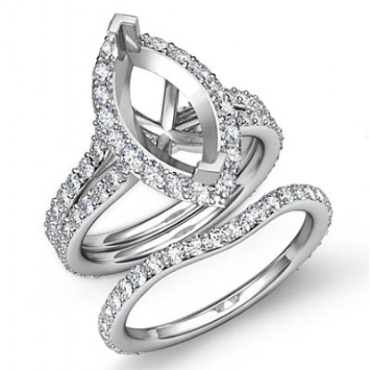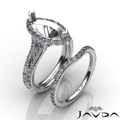 Show your love with this semi mount marquise engagement ring and matching band that features round diamonds in halo and split shank. This bridal set is made in 18k Gold White. (1.9Ct. tw.)