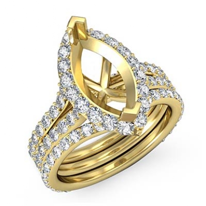 Show your love with this semi mount marquise engagement ring and matching band that features round diamonds in halo and split shank. This bridal set is made in 18k Gold Yellow. (1.9Ct. tw.)