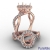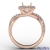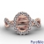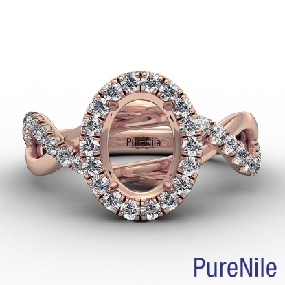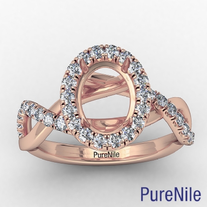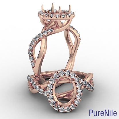 Women's oval diamond engagement ring crafted in 14k Rose Gold. This halo diamond ring features criss cross shank and oval cut semi mount with side diamonds in a U split prong setting. Available in white gold, yellow gold, rose gold and platinum. (0.5Ct. tw.)