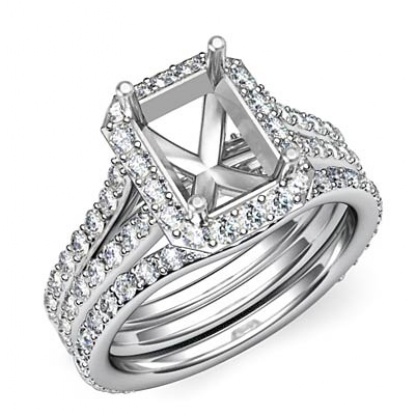 Get mesmerized with this semi mount bridal set, showcasing a diamond-laden split shank and halo in pave setting, with a matching band. This engagement ring is framed against enduring Platinum 950. (1.7Ct. tw.)