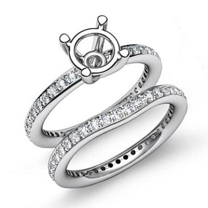 This semi mount diamond engagement wedding ring and matching band feature a center semi mount round diamond in prong setting and pave set diamonds along the shank. This set is made in 18k Gold White. (1.26Ct. tw.)