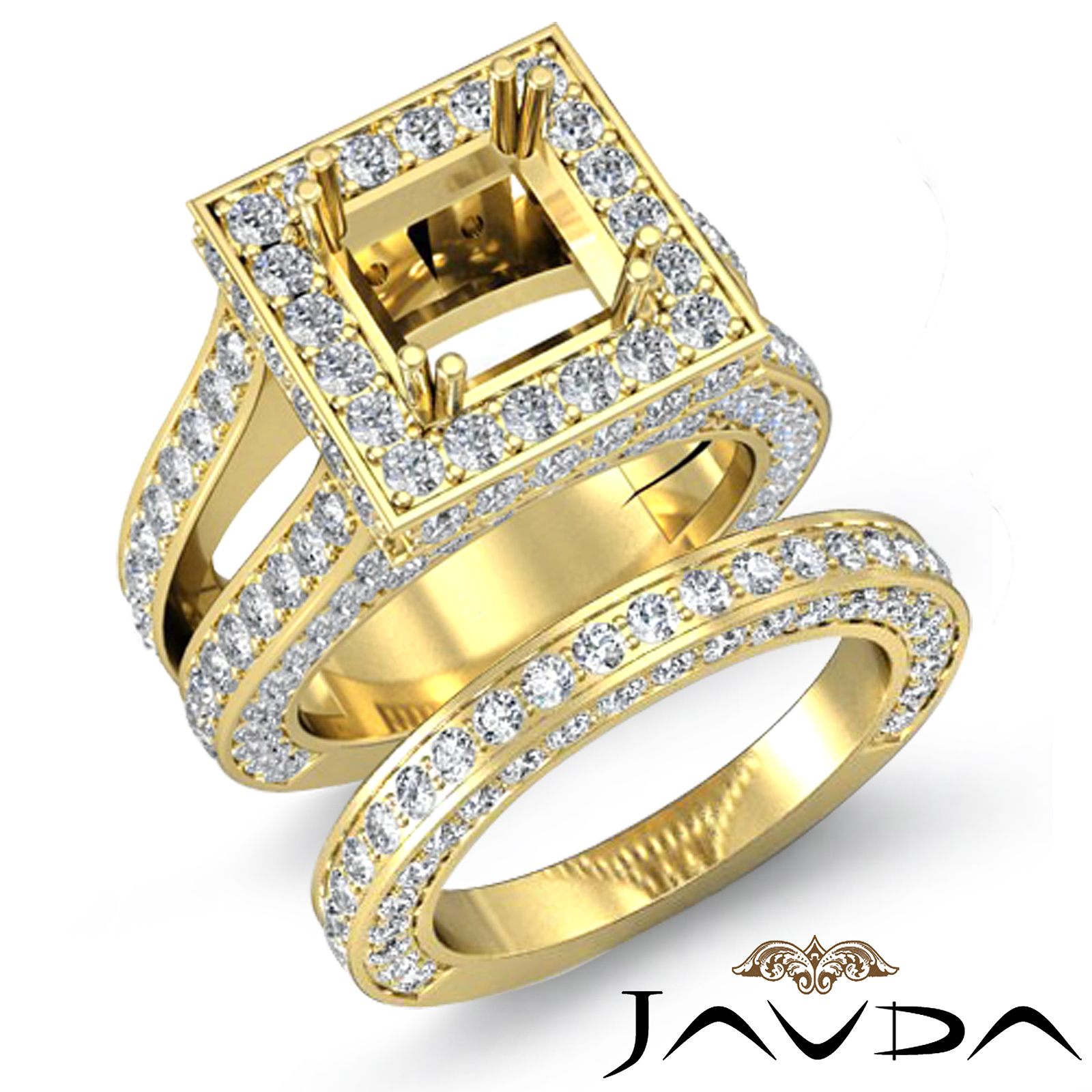 Elegant in any way, this princess semi mount engagement ring and bridal set feature round pave set diamonds along the halo and split shank. The bridal set is made in 14k Gold Yellow. (3.75Ct. tw.)