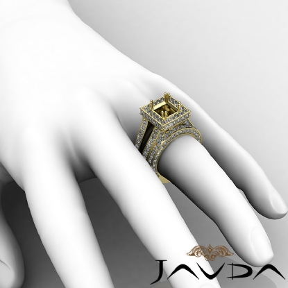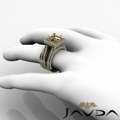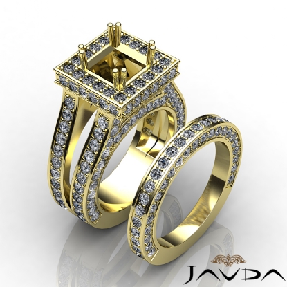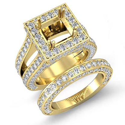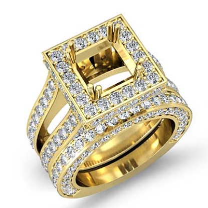Elegant in any way, this princess semi mount engagement ring and bridal set feature round pave set diamonds along the halo and split shank. The bridal set is made in 18k Gold Yellow. (3.75Ct. tw.)