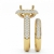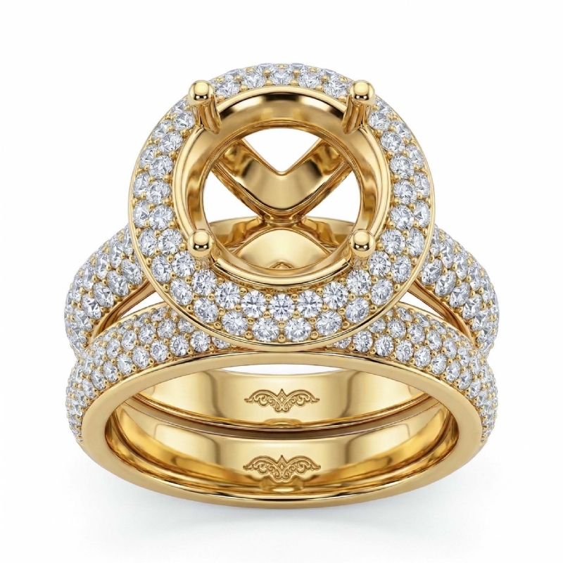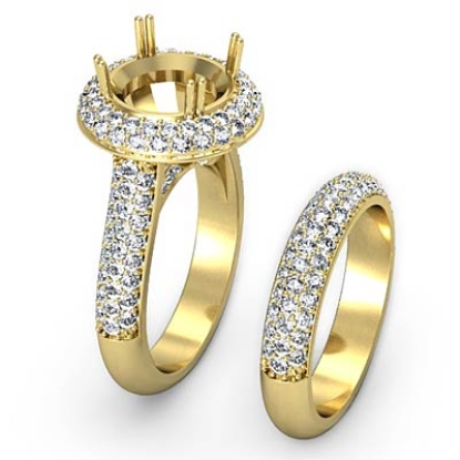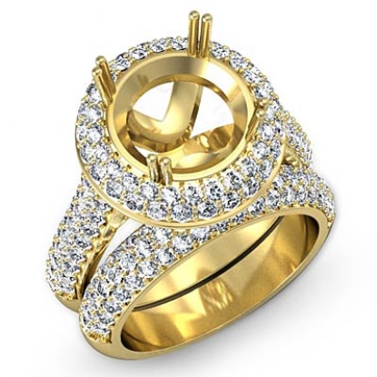 Stunning & intricate, this semi mount engagement ring comes with a matching band. It features sparkling pave set diamonds along the halo and the split shank. This bridal set is made in 14k Gold Yellow. (2.5Ct. tw.)