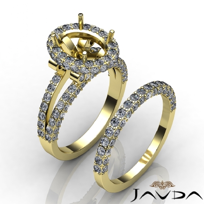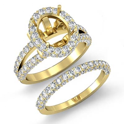 Ideal for the occasion, this 14k Gold Yellow bridal set consists of a semi mount engagement ring and a matching band, featuring round pave set diamonds in halo and split shank. (2.6Ct. tw.)