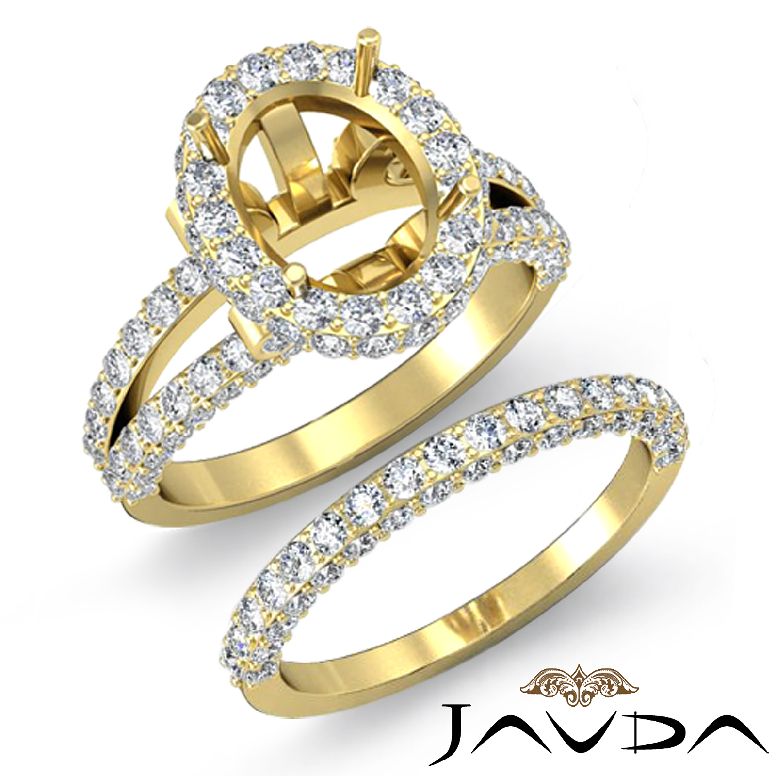 Ideal for the occasion, this 18k Gold Yellow bridal set consists of a semi mount engagement ring and a matching band, featuring round pave set diamonds in halo and split shank. (2.6Ct. tw.)