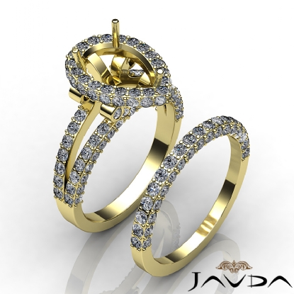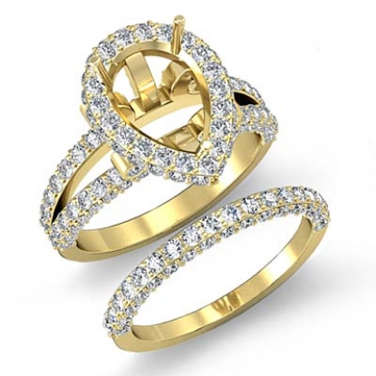 Beautiful & delicate, this 14k Gold Yellow bridal set consists of a semi mount engagement ring and a matching band, featuring round pave set diamonds in halo and split shank. (2.72Ct. tw.)