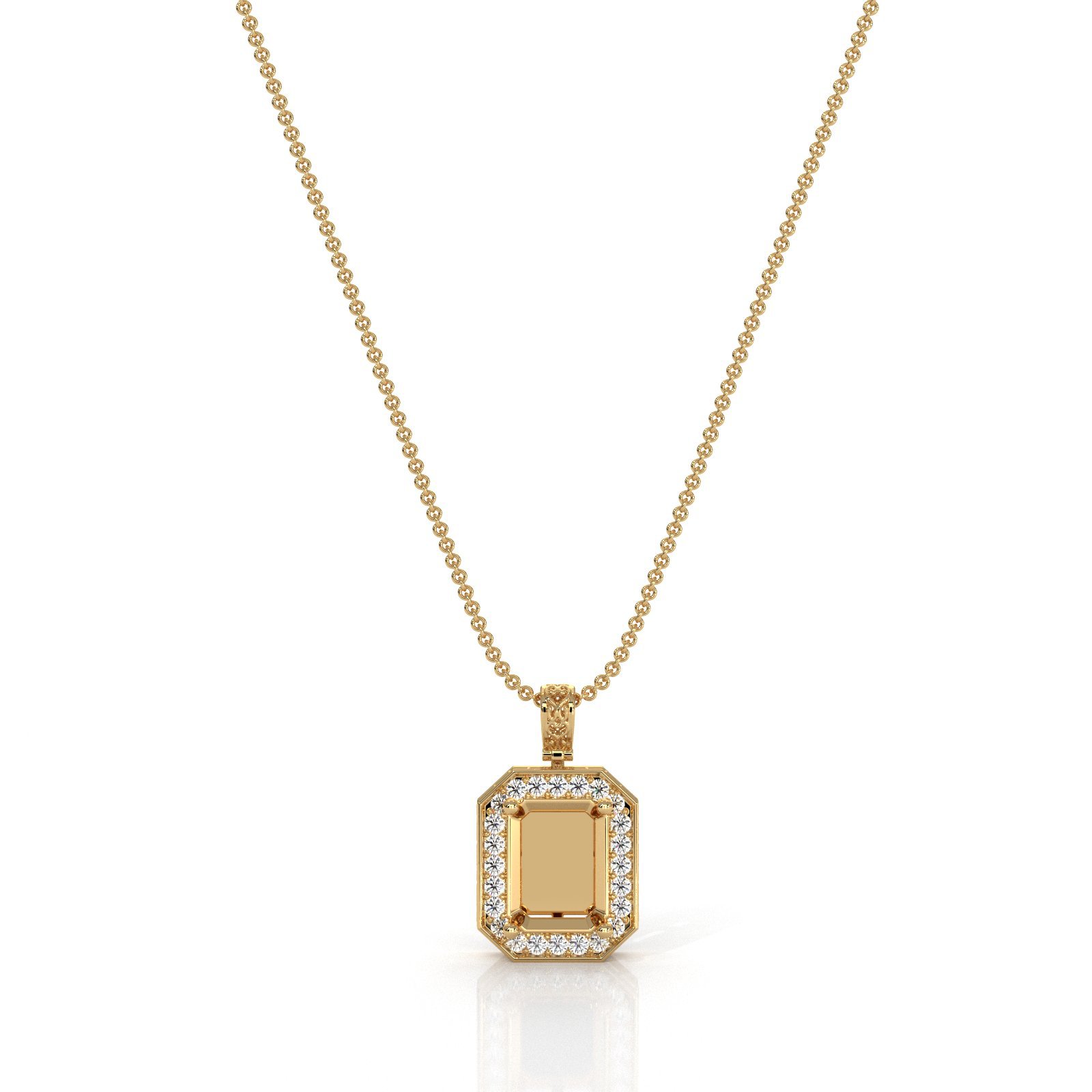 This round pre-set pave diamond halo pendant is made for a radiant cut solitaire. Expertly crafted in 14k Gold Yellow for a refined and luxurious finish. Perfect for showcasing your center stone with brilliant sparkle and style. Includes a matching rolo link chain for a polished presentation.