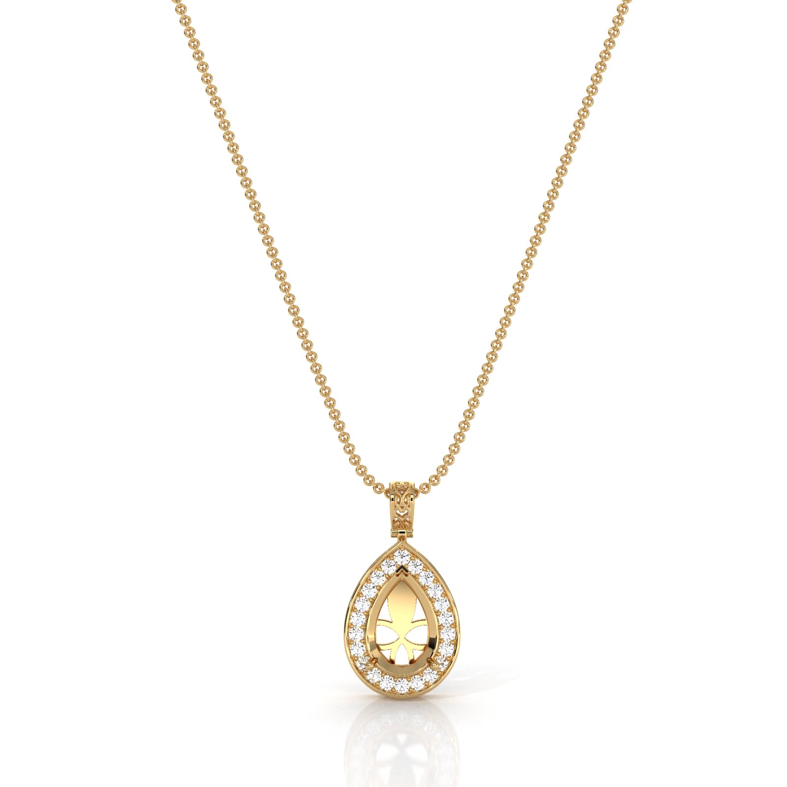 This elegant pendant features a round pre-set pave diamond solitaire with accent, crafted to fit a pear cut diamond center in luxurious 18k Gold Yellow. Perfectly balanced between modern sparkle and timeless form. Also available in 14k yellow gold, 14k rose gold, 18k gold, and platinum.