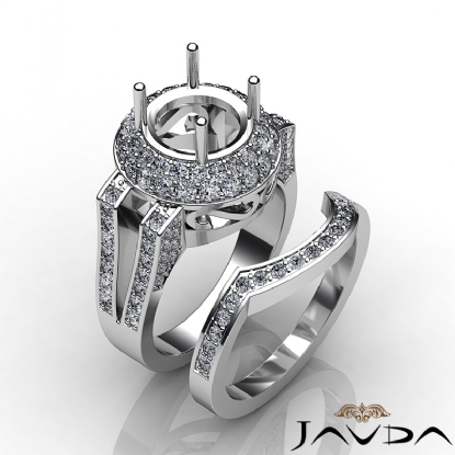 Bold and Beautiful! This 18k Gold White semi mount engagement ring comes with a matching band. It features round pave set diamond in halo and split shank. This bridal set will be loved by her! (1.45Ct. tw.)