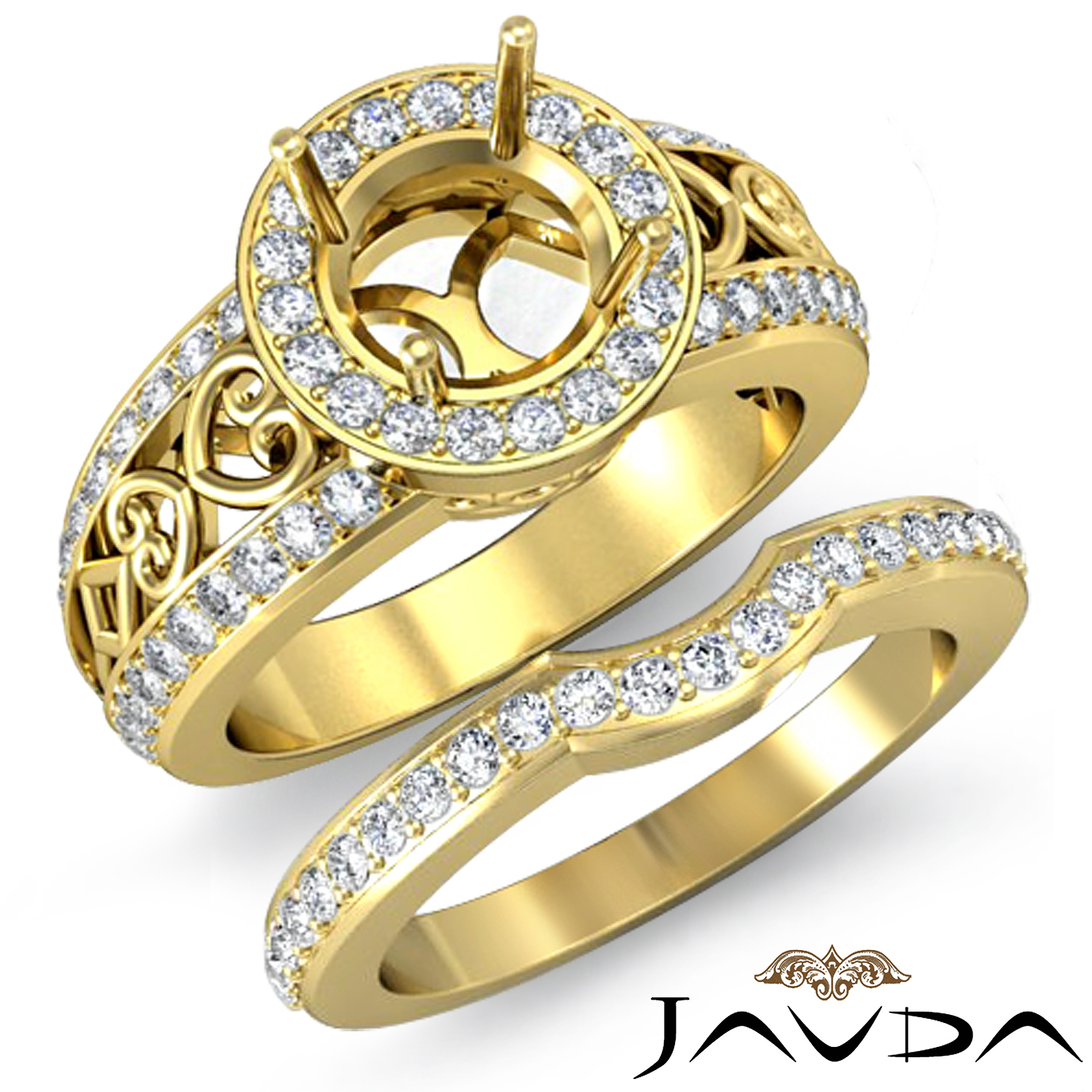 Timeless Masterpiece! This semi mount engagement ring with matching band features pave set diamonds in halo and along the shank, with delicate filigree in between looking gorgeous. This bridal set is made in glistening 14k Gold Yellow. (1.52Ct. tw.)