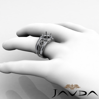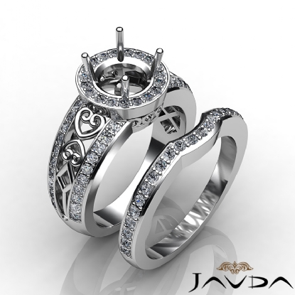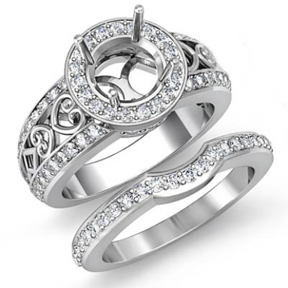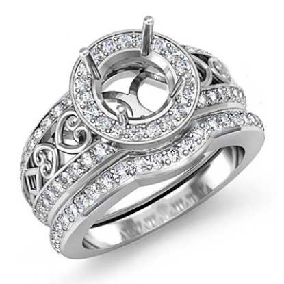 Timeless Masterpiece! This semi mount engagement ring with matching band features pave set diamonds in halo and along the shank, with delicate filigree in between looking gorgeous. This bridal set is made in glistening 18k Gold White. (1.52Ct. tw.)