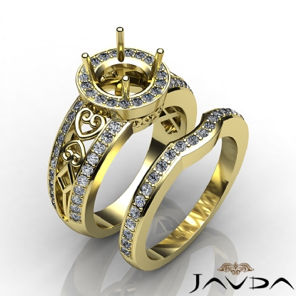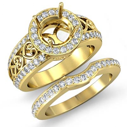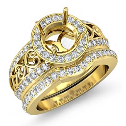 Timeless Masterpiece! This semi mount engagement ring with matching band features pave set diamonds in halo and along the shank, with delicate filigree in between looking gorgeous. This bridal set is made in glistening 18k Gold Yellow. (1.52Ct. tw.)