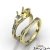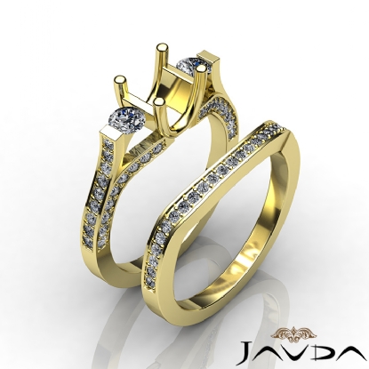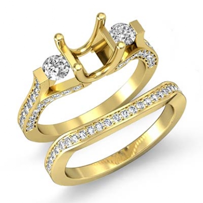 This three stone round semi mount engagement ring comes with a matching band, showcasing pave set diamonds on the shank and round side diamonds. Made in 18k Gold Yellow, this bridal set will set the standards high! (1.5Ct. tw.)
