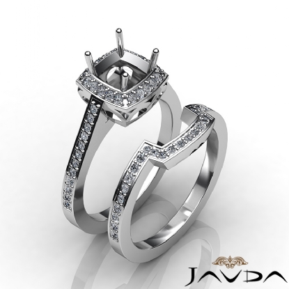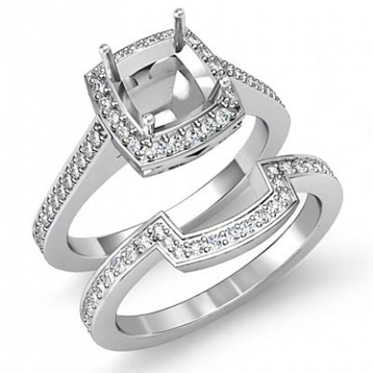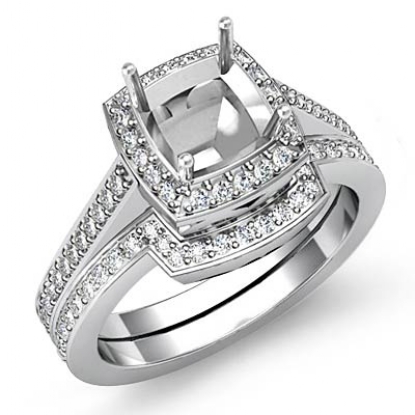 Gorgeous! This bridal set is such a stunner! It consists of a cushion semi mount engagement ring and a matching band, featuring pave set diamonds on halo and the shank. This beautiful diamond set is made in 18k Gold White. (1Ct. tw.)