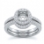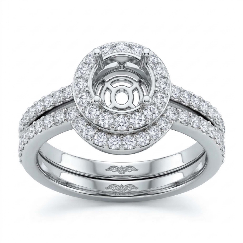 Masterpiece! This bridal set is such a stunner! It consists of a round semi mount engagement ring and a matching band, featuring pave set diamonds on halo and the shank. This beautiful diamond set is made in Platinum 950. (1Ct. tw.)