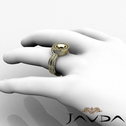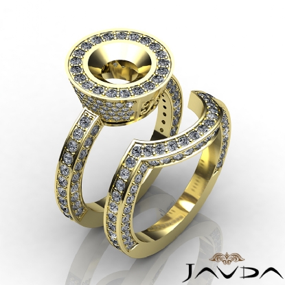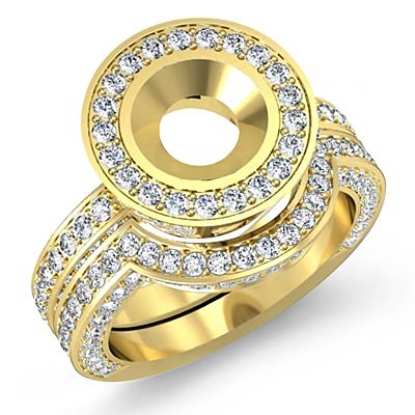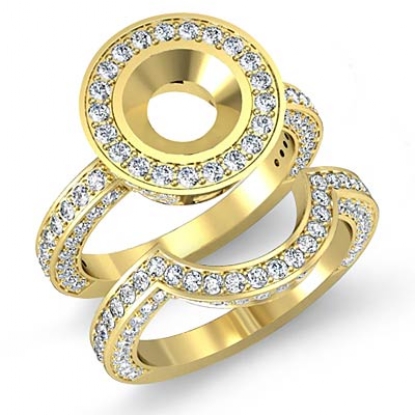 Elegant with a touch of vintage, this semi mount diamond engagement ring comes with a matching band, featuring pave set diamonds on halo and the shank. Made in 18k Gold Yellow, this bridal set is fabulous! (3Ct. tw.)