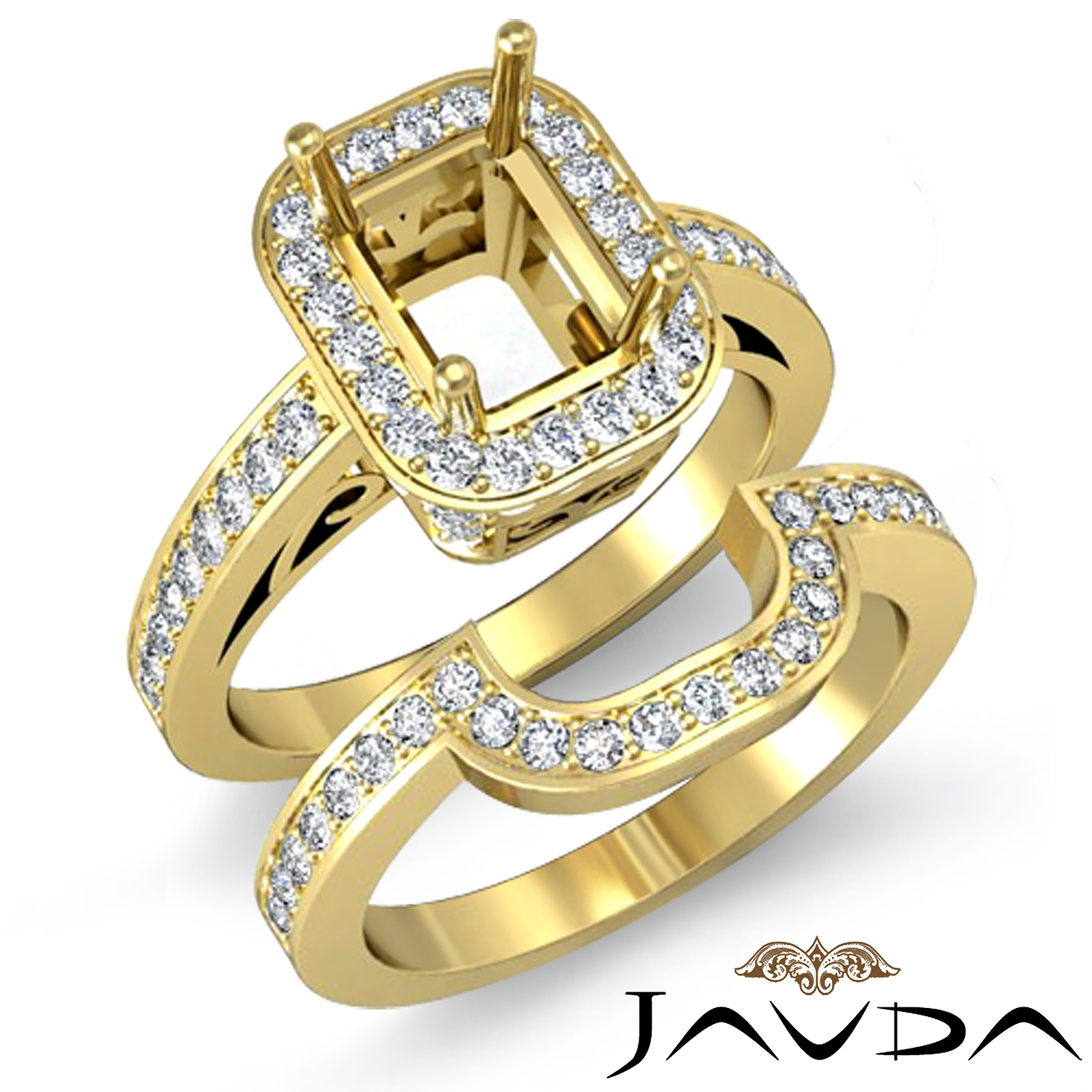 Elegant in simplicity, this semi mount engagement ring with matching band features round pave set diamonds in halo and along the shank. This stunning bridal set is made in 18k Gold Yellow. (1.62Ct. tw.)