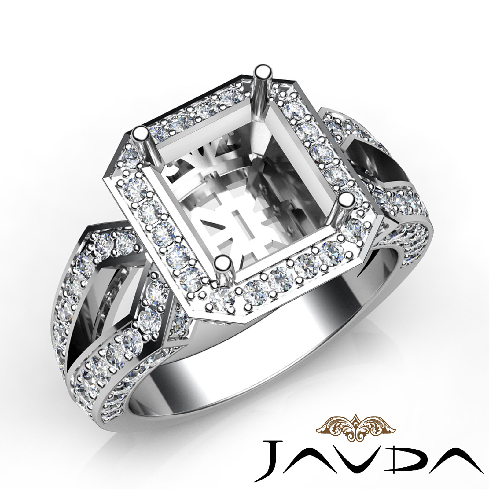 An elegant statement, this split-shank diamond halo engagement ring captures all the romance with pave set round diamonds in the semi mount halo and the shank. This ring is made in glorious 18k Gold White (1.4Ct. tw.)
