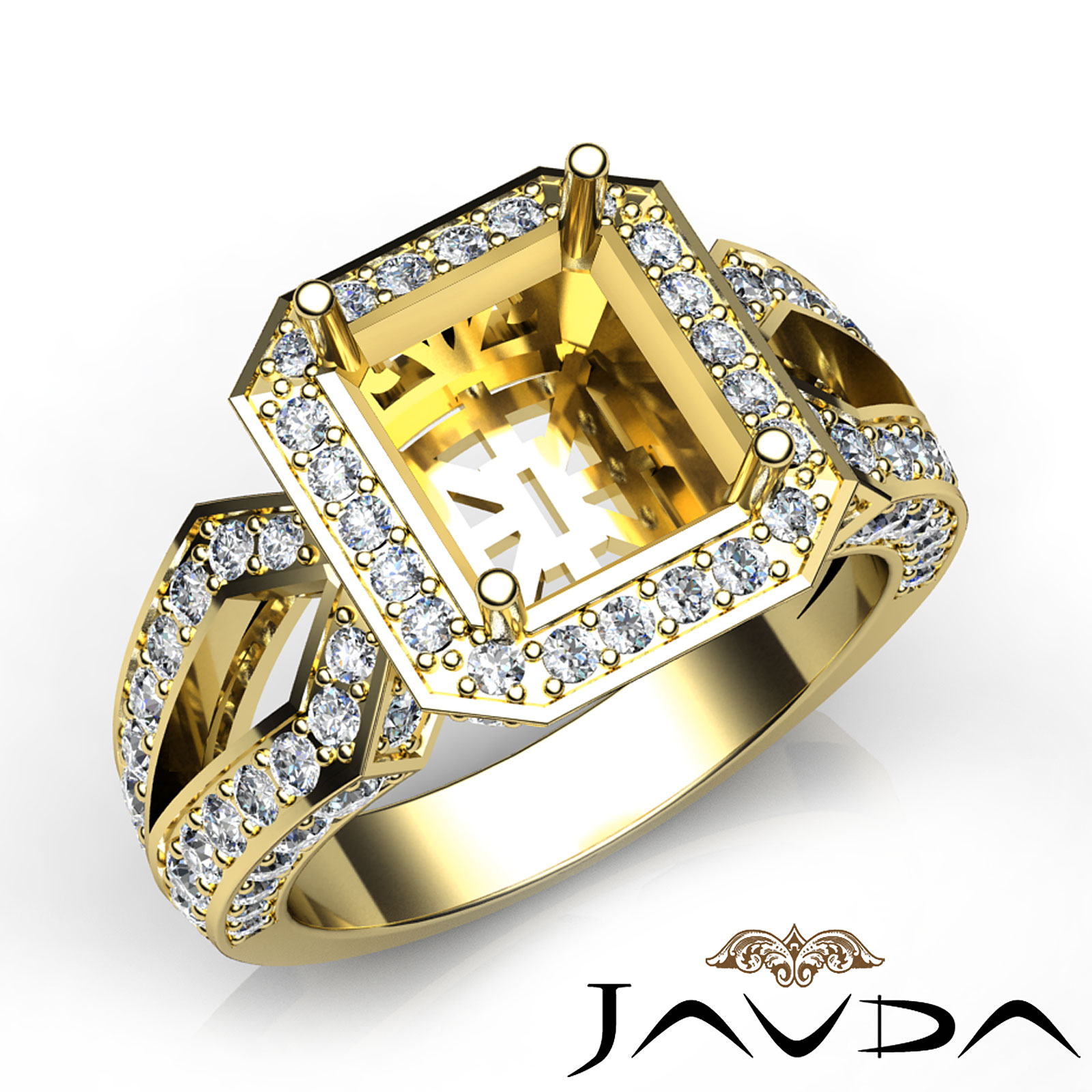 An elegant statement, this split-shank diamond halo engagement ring captures all the romance with pave set round diamonds in the semi mount halo and the shank. This ring is made in glorious 18k Gold Yellow (1.4Ct. tw.)