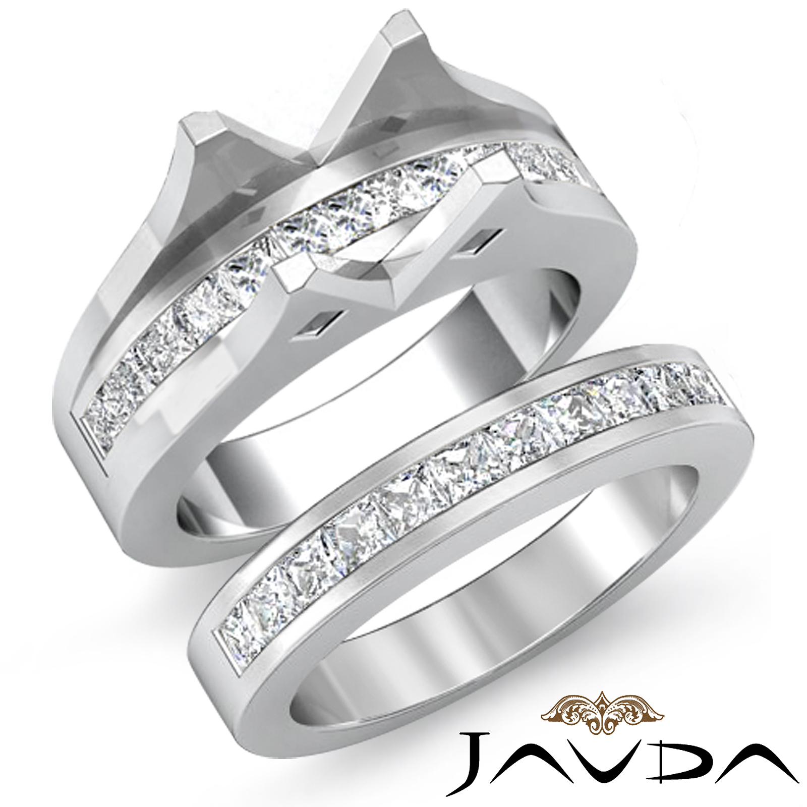 Unique in its own way! The princess channel set diamond engagement ring for round semi mount comes with a matching band. A complete bridal set made in Platinum 950. (2.1Ct. tw.)