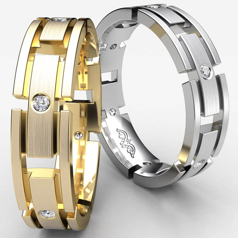 Handsome matte finished bezel set diamond men's eternity wedding band crafted in 18k Gold Yellow. This ring features solid link, each link is adorned with a beautiful diamond set in a bezel setting.