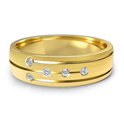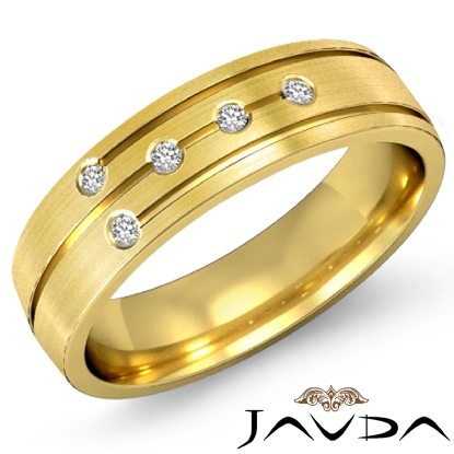 This solid matte finish men's diamond eternity wedding band made from 18k Gold Yellow. Featuring 5 diamonds in a bezel setting with grooved. This low dome ring is comfort fits and available in 14k & 18k white gold, yellow gold and rose gold & platinum 950. (0.15Ct. tw.)