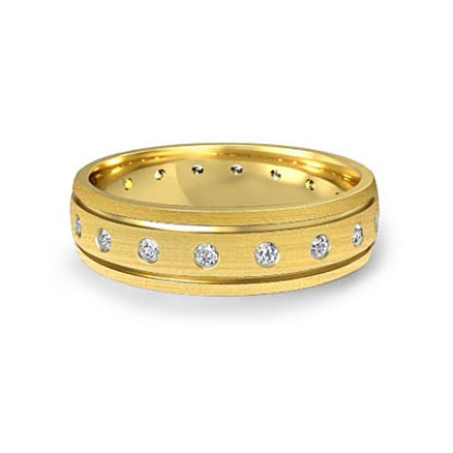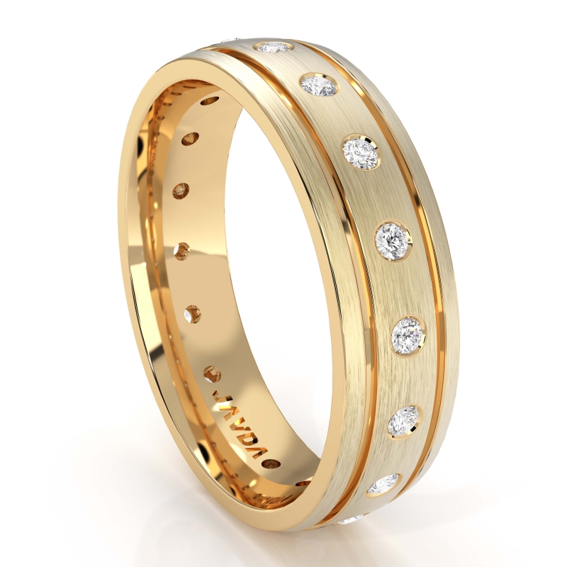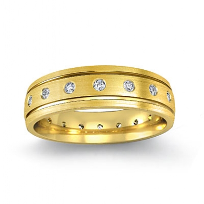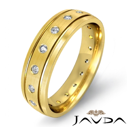 Matte finished bezel set diamond men's eternity wedding band made from solid 14k Gold Yellow. Featuring grooved edges with