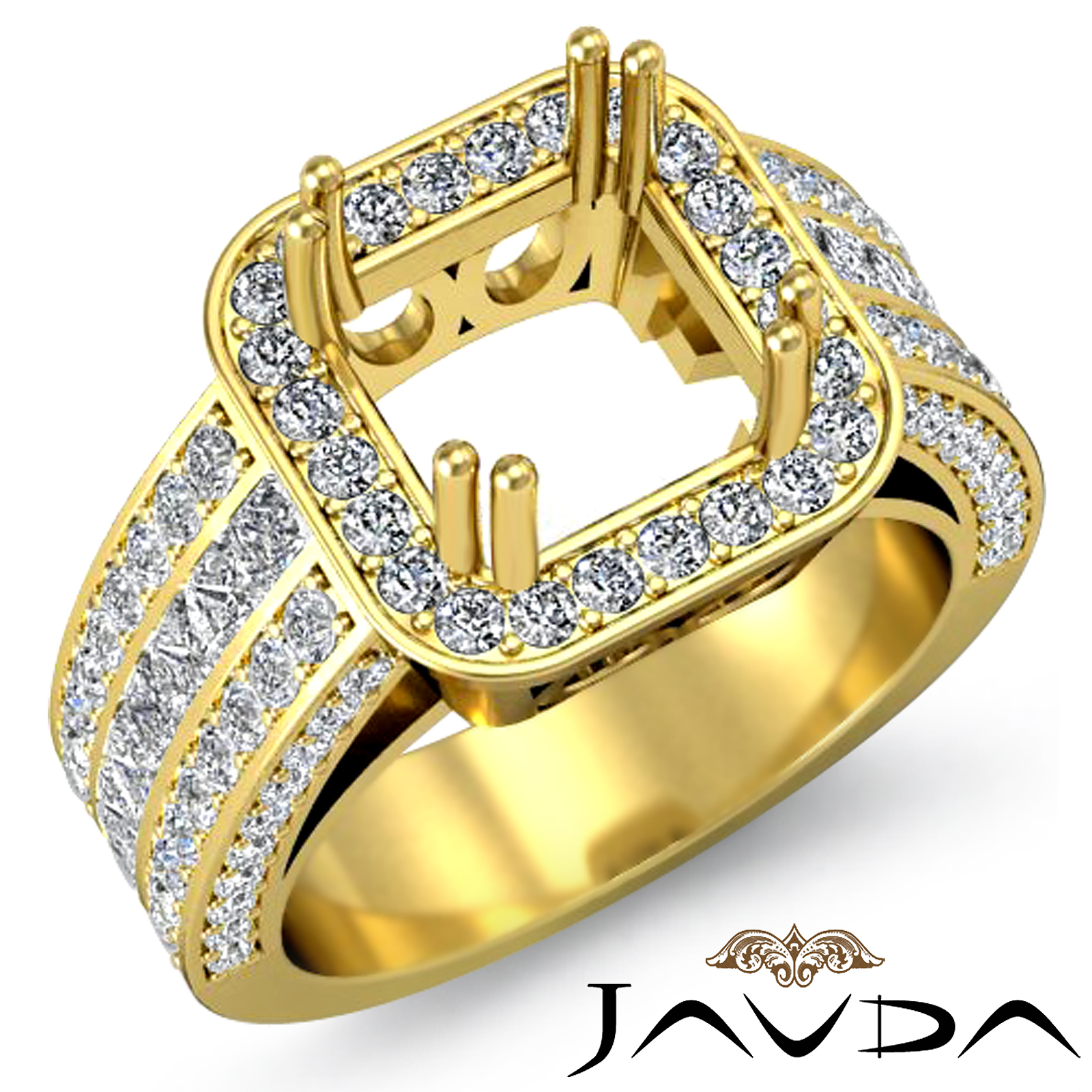 Lavishly romantic, this trio shank halo diamond engagement princess semi mount ring is made in glorious 14k Gold Yellow. This princess cut ring features . round diamonds in pave setting on halo &