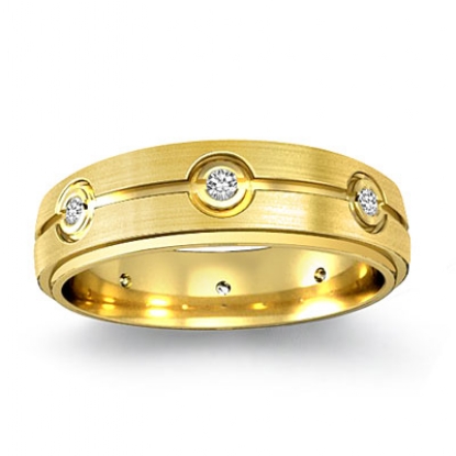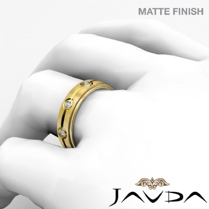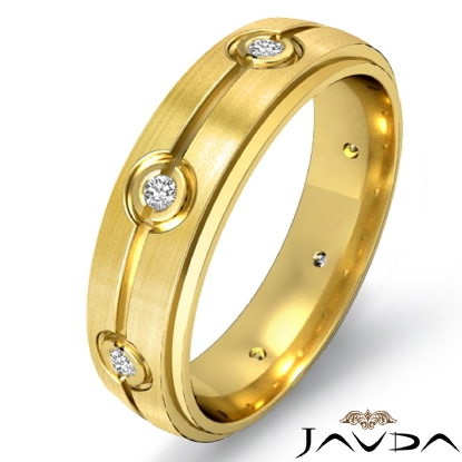 This matte finished men's diamond eternity wedding band crafted in 14k Gold Yellow. Featuring step edge & center grooved with total round diamonds are set in a bezel setting.