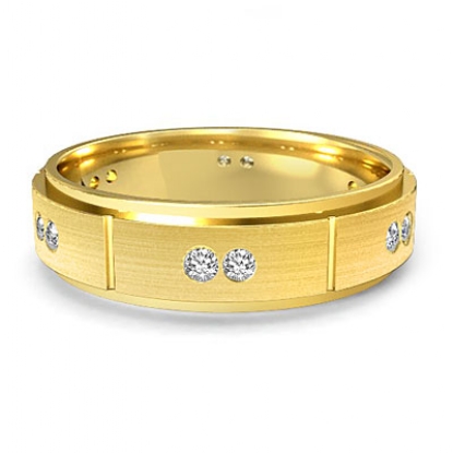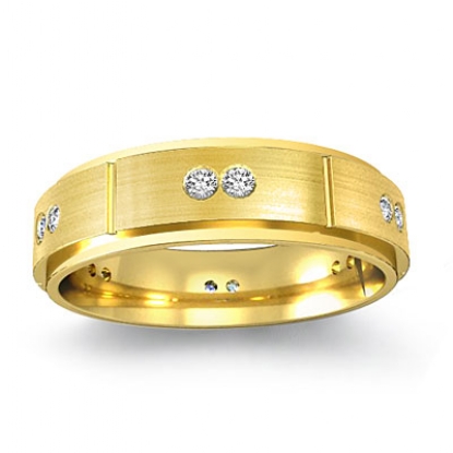 This stunning men's eternity wedding band made from 18k Gold Yellow. The ring has a matte finished center and polished step edge with total round diamonds set in a bezel setting.