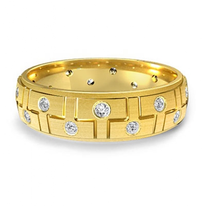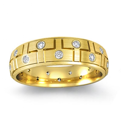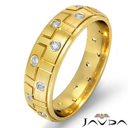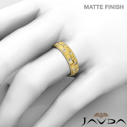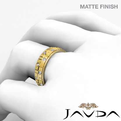 Solid carved design matte finished men's diamond eternity wedding band crafted in 14k Gold Yellow. Featuring step edges and total round diamonds set in a bezel setting.