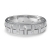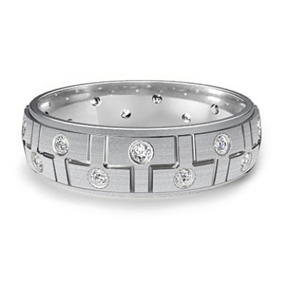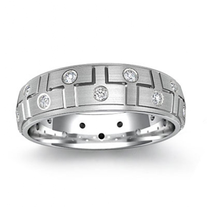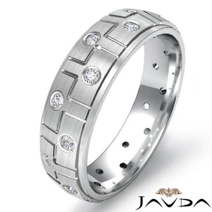 Solid carved design matte finished men's diamond eternity wedding band crafted in 18k Gold White. Featuring step edges and total round diamonds set in a bezel setting.