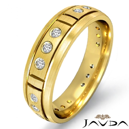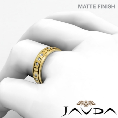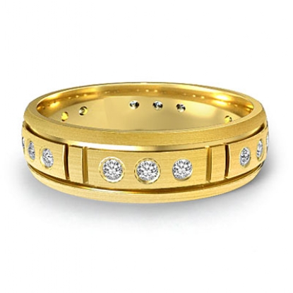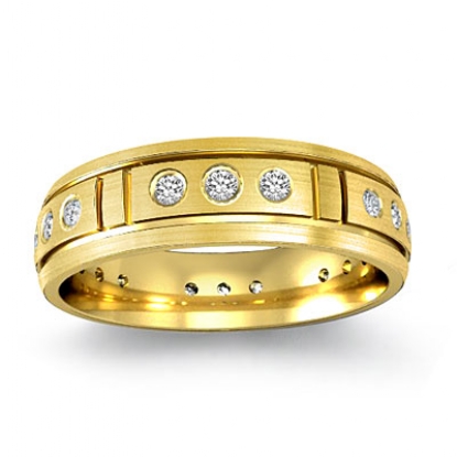 Solid matte men's eternity wedding band made from 18k Gold Yellow. The ring has a parallel grooved with center cut and total round diamonds set in a bezel setting.