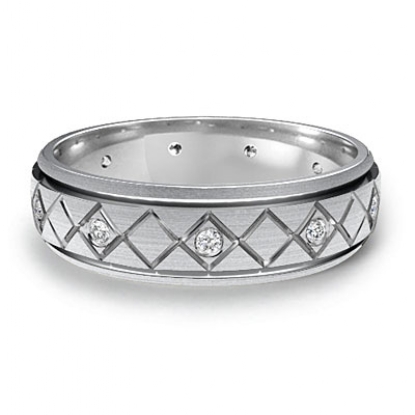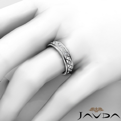 Intricately designed, this men's eternity wedding band made from solid 18k Gold White. The ring has a diamond cut design on matte finished center with total round diamonds set in a bezel setting and polished step edge.
