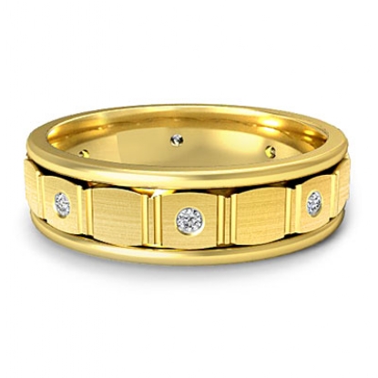 A modern brushed finished eternity men's wedding band crafted in 18k Gold Yellow. Featuring polished round edges and verticle center cuts with total round diamonds set in a bezel setting.