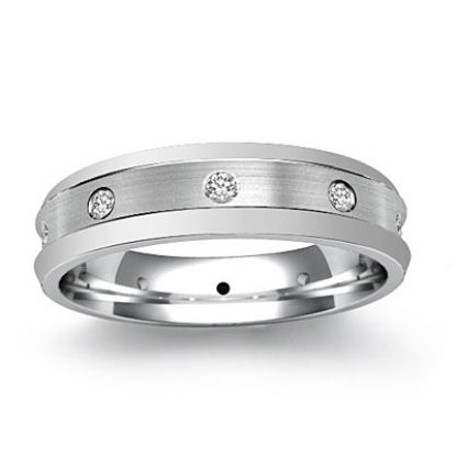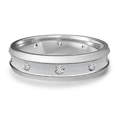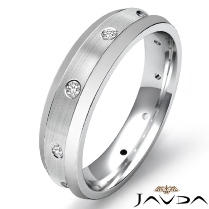 This elegant solid eternity men's wedding band crafted in Platinum 950. Featuring matte finished concave design and polished beveled edge with total round diamonds in a bezel setting.