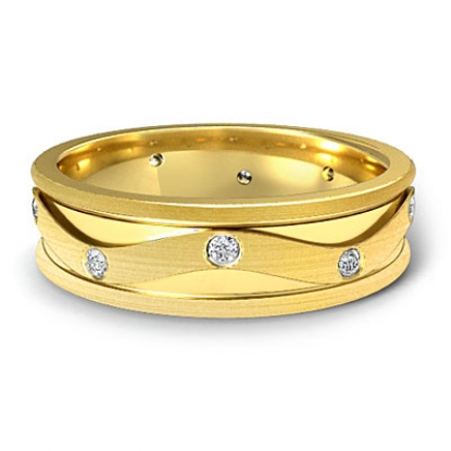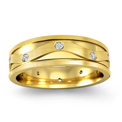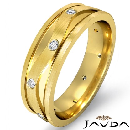 Matte finished eternity men's wedding band made from 14k Gold Yellow. Featuring wave design with total round diamonds in a bezel setting.