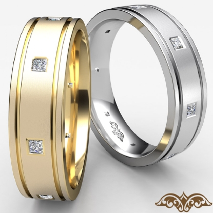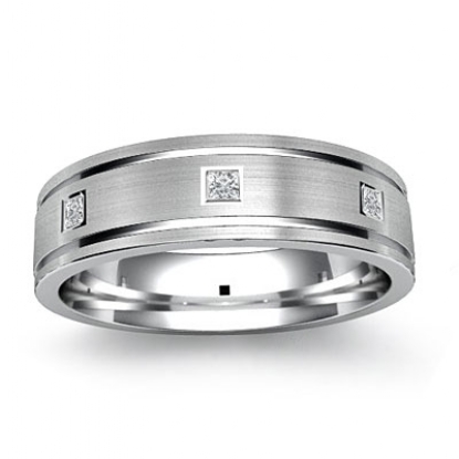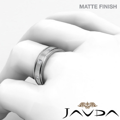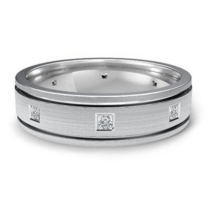 The matte finished diamond eternity men's wedding band made from 18k Gold White. This wedding ring features parallel grooves with total princess cut diamonds set in a bezel setting.