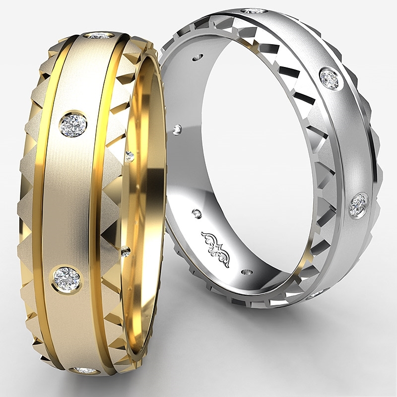 This unique design matte finished men's diamond eternity wedding band made from solid 14k Gold Yellow. Featuring triangle cut edges with total round diamonds in a bezel setting.