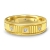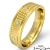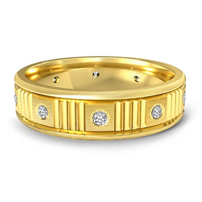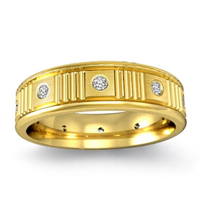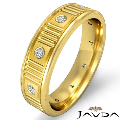 This handsome men's eternity wedding band made from 14k Gold Yellow. The solid ring has a verticle cuts and round polished edges with matte finished center. Featuring total round diamonds set in a bezel setting.
