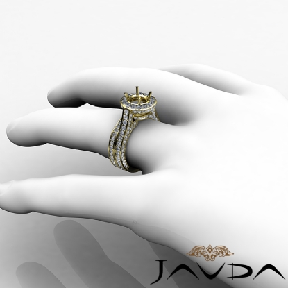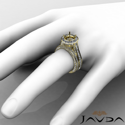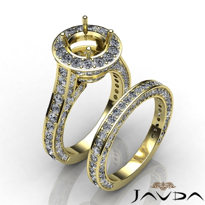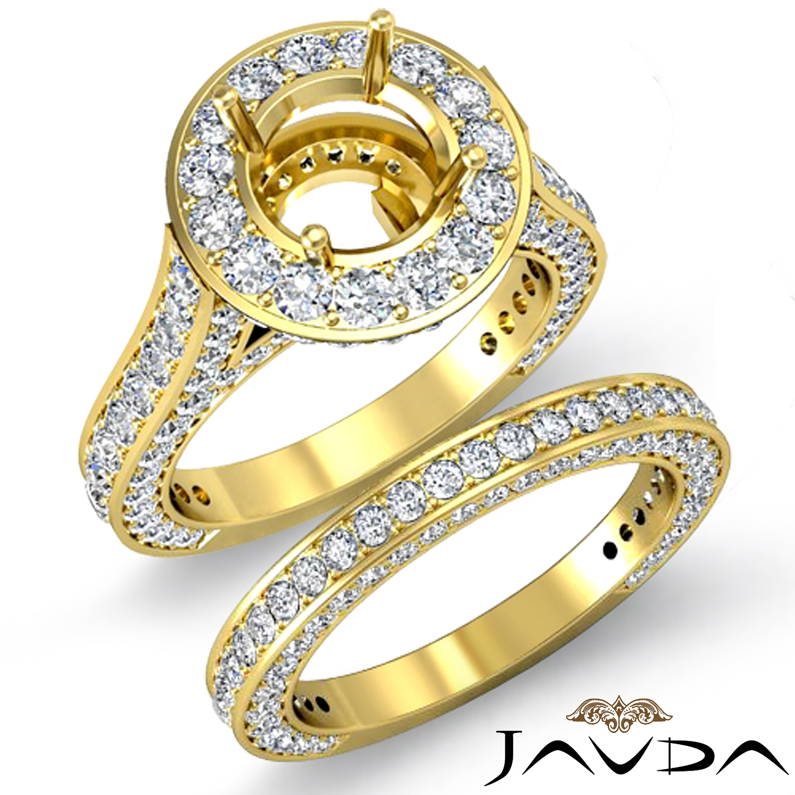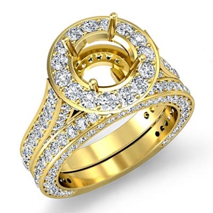 Inspired by vintage design, this halo pave set, semi mount engagement ring comes with an equally gorgeous matching band. Made in 14k Gold Yellow, this bridal set will be the perfect choice. (3.45Ct. tw.)